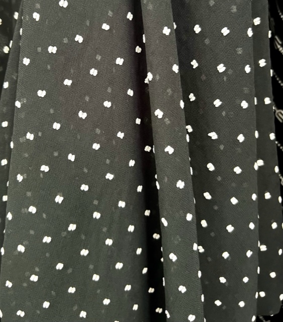 100% Polyester – Black Chiffon with a Over White Stitching – 135cm wide – 100% Polyester – $15.00 per mtr