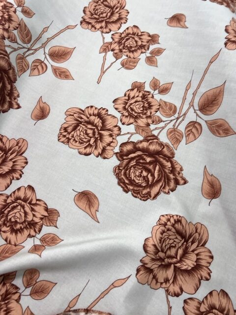100% Rayon – The background is Fawn, not off white as the photo shows