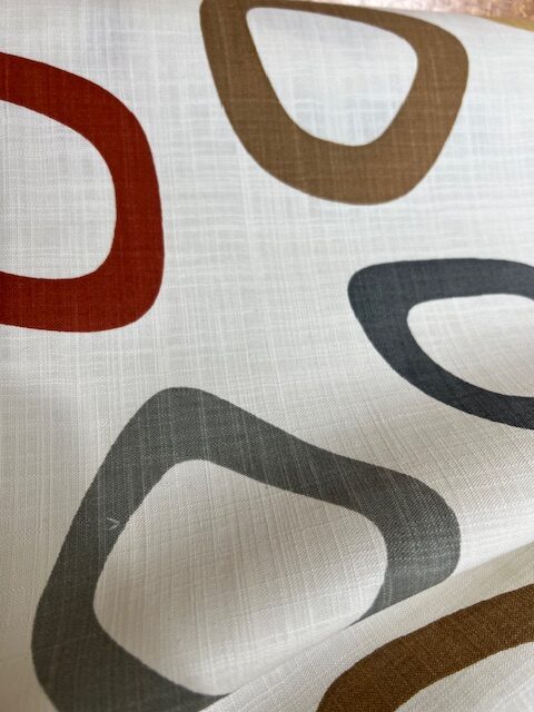 / C204 – Curtaining – Abstract oblong Circles of Terrocotta, Grey and Mustard – 138cm wide – 100% Polyester – $15.00 per mtr