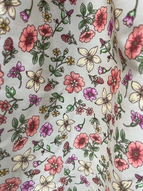 DC70 – Dress Cotton – Tan with Peach, Cream and Pinkish Flowers – 100% Dress Cotton – 1.12cm wide – $16.00 per mtr