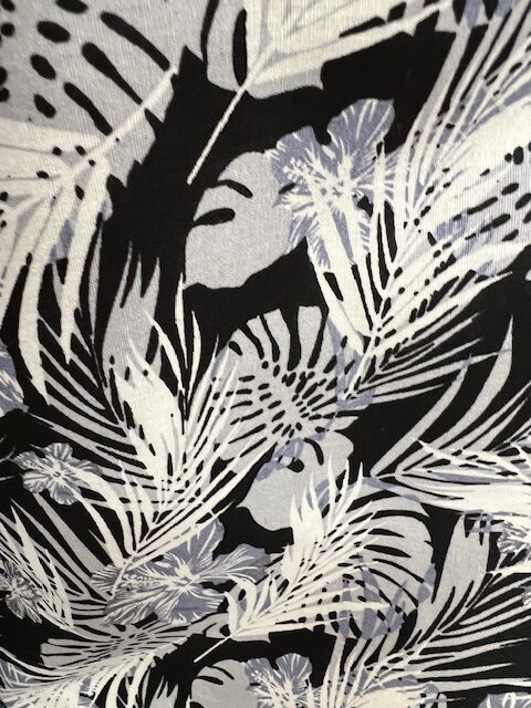 / DC66 – Dress Cotton – Large Grey and White Fern Leaves on Black 100% Dress Cotton – 1.12cm wide – $16.00 per mtr
