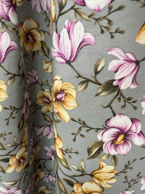 / DC71 – Dress Cotton – Lemon and Pale Pink Flowers on Grey 100% Dress Cotton – 1.12cm wide – $16.00 per mtr