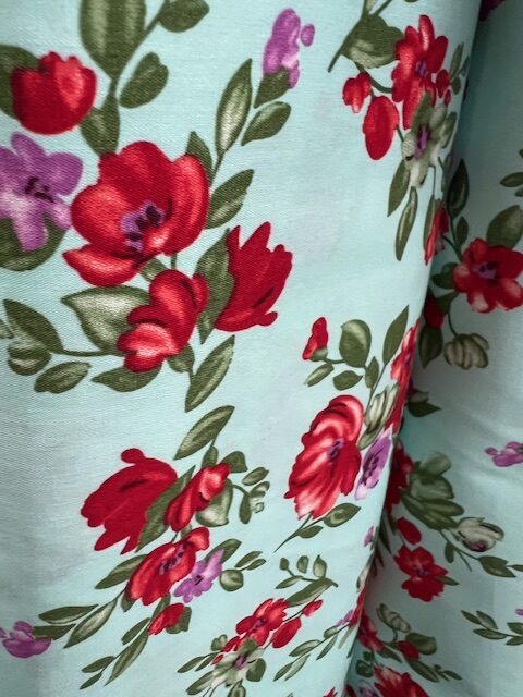 DC73 – Dress Coton – Rose Red and Lilac on Mint 100% Dress Cotton – 1.12cm wide – $16.00 per mtr