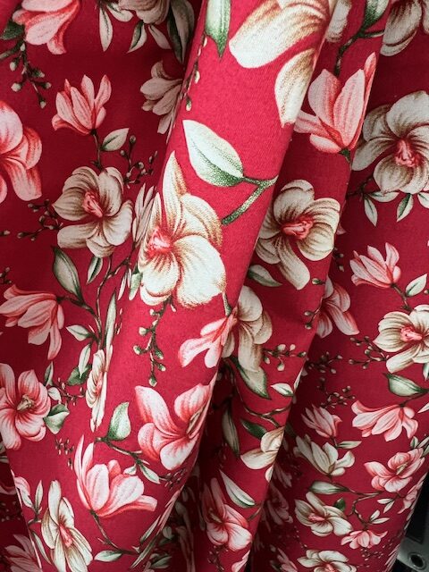 / DC75 – Dress Cotton – Cream and Pale Pink Flowers on Rosie Red 100% Dress Cotton – 1.12cm wide – $16.00 per mtr