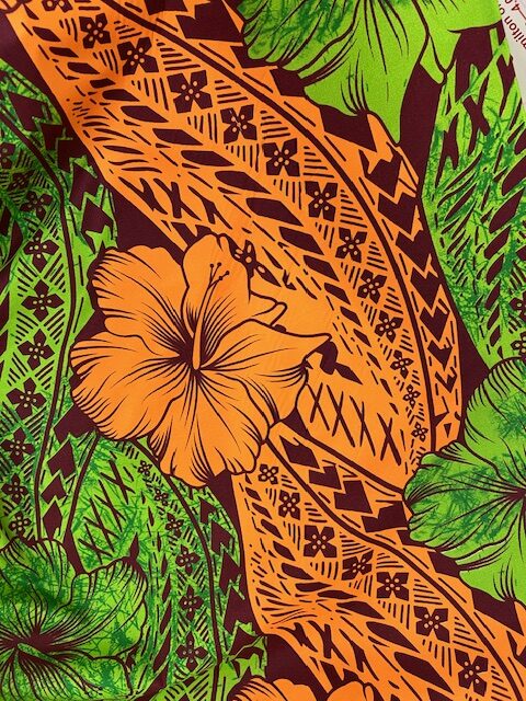 IP14 – Island Prints – Orange Hibiscus Flowers on Emerald Green and Brown design – 1.15cm wide – 65% Polyester / 35% Cotton – $8.00pm – Special $5.00 per mtr