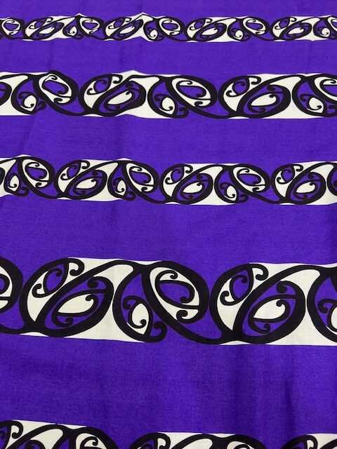 / MP-S1C – Purple with Black and White Maori Design 1 – 100% Rayon – 1.15cm wide – $15.00 per mtr