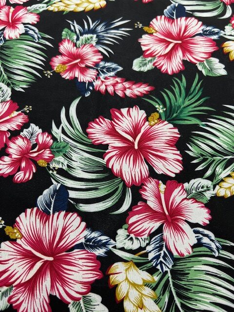 / P115 – Georgette – Black with Colourful Red Hibiscus Flowers – 100% Polyester – 150cm wide – $18.00 per mtr
