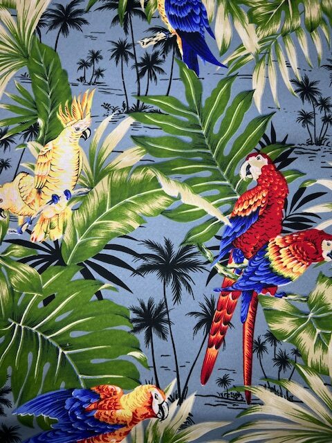 Peach Skin – PS27 Grey – Vibrant Parrots with Colourful Tropical Flowers on Peach Skin – 100% Polyester – 1.10cm wide $14.00 per mtr