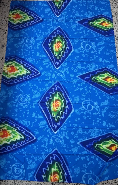 100% Polyester – Best as it dries fast, doesn’t fade or stick to wet skin