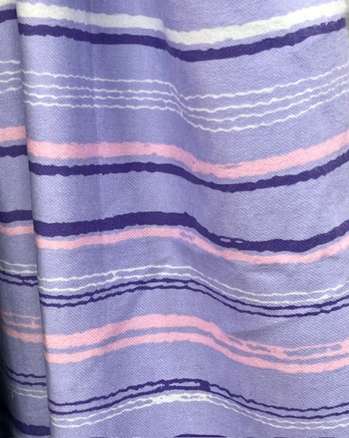 Wincyette – #8 – 100% Brushed Cotton – Purple, Pink and White Wonky Strips on Lovely Lilac – 150cm wide – $14.00 per mtr